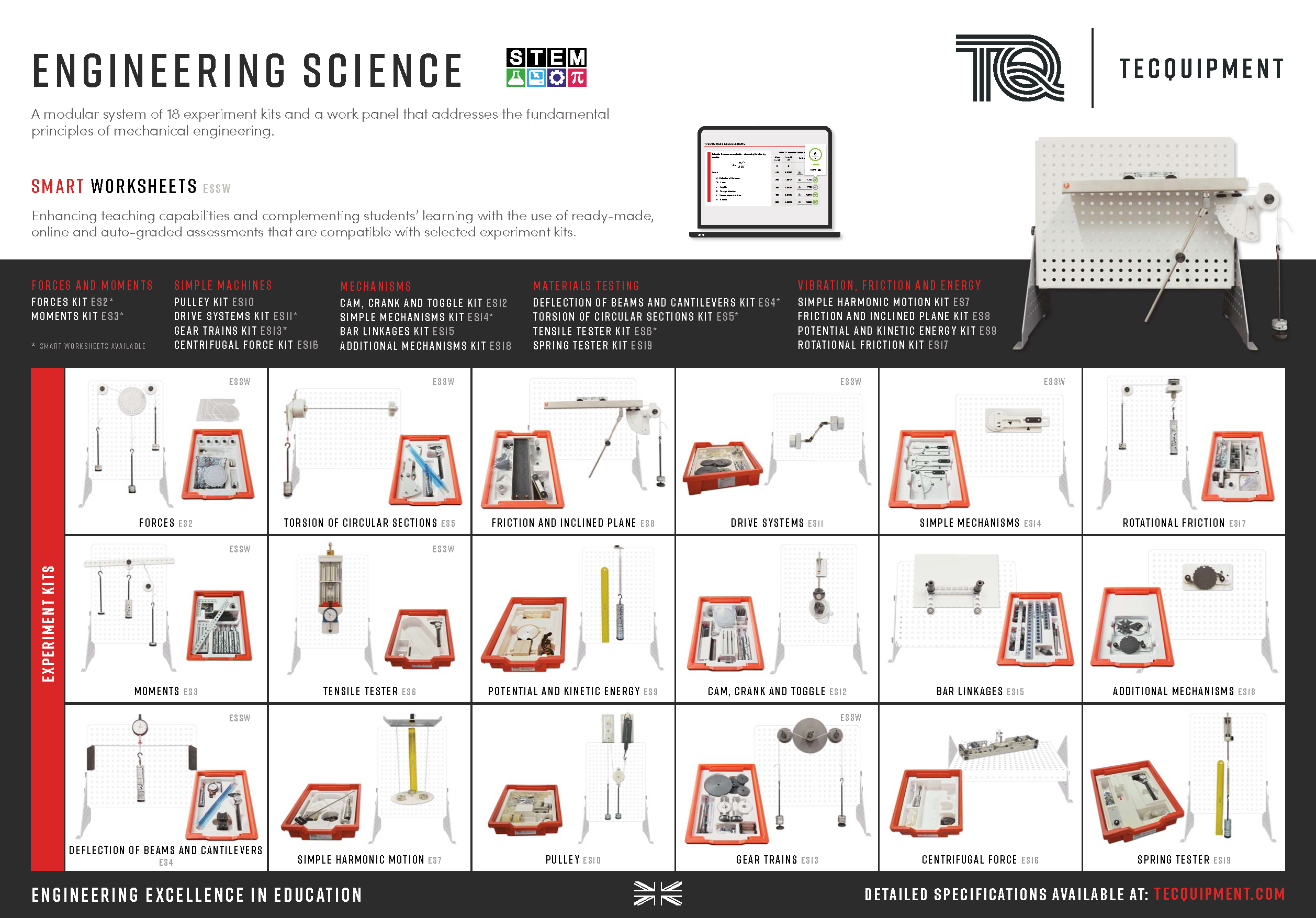 A complete package in Engineering Science experiments. The full set includes the Engineering Science mobile trolley (EST), a full set of TecQuipment’s Engineering Science kits (ES2 to ES19), Work Panels (ES1) and a Spares Kit (ESX). Refer to the separate datasheets for more details on these individual products.