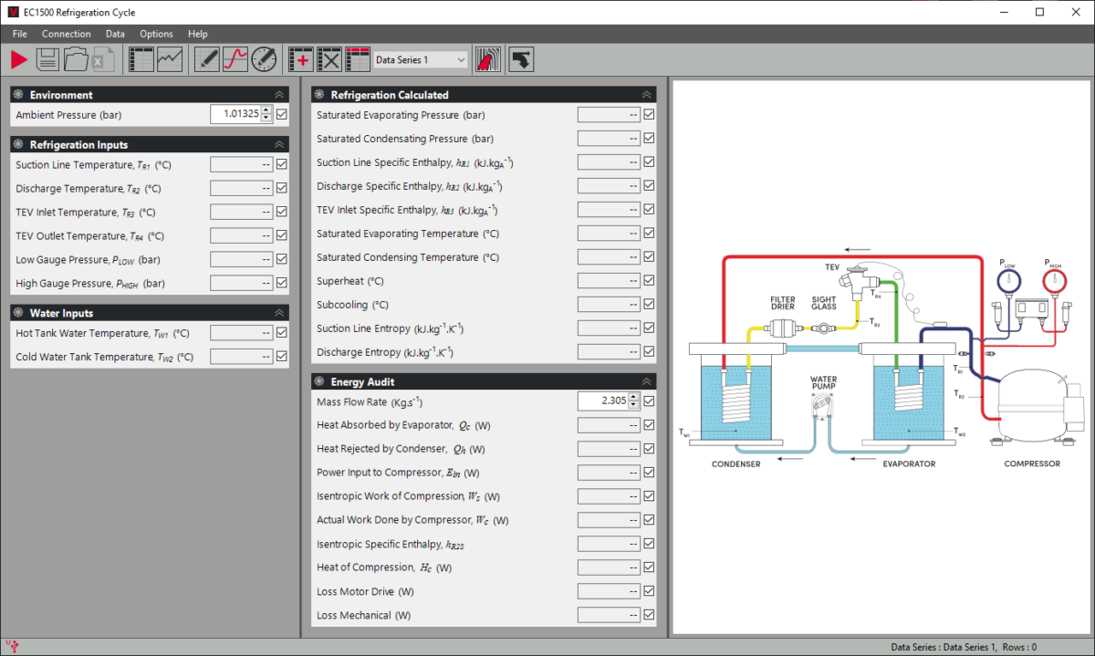 This simple refrigeration cycle unit assists students to learn the stages of refrigeration at an entry level. Students learn about Pressure-Enthalpy charts and use them to determine the Coefficient of Performance (COP), superheat and sub-cooling from the enthalpy changes.
